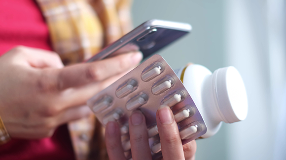 لقد أصبح من الواضح تدريجيًّا أنّ دورات العلاج القصيرة بالمضادّات الحيويّة لا تقلّ فعاليّة عن الدورات الطويلة. امرأة تحمل الدواء وتنظر إلى الهاتف | Yavdat, Shutterstock
