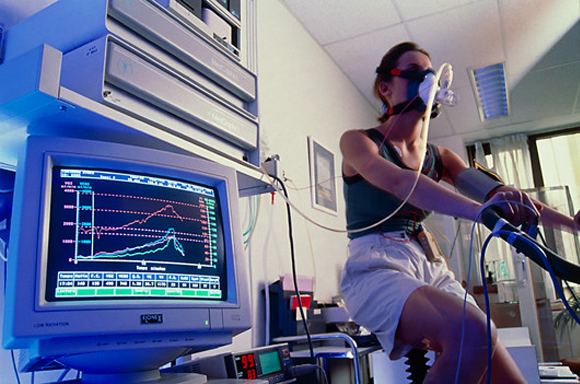لاختبار اللّياقة البدنيّة للشّخص، يتمّ قياس الحدّ الأقصى لاستهلاكه الأكسجين أثناء المجهود. اِمرأة تركب درّاجة خلال اختبار المجهود | BSIP, Laurent / B. Hop Ame / Science Photo Library