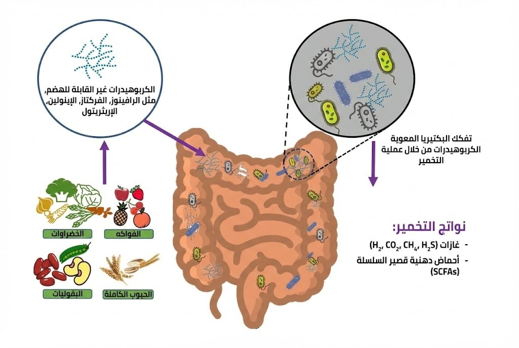 تصل الموادّ الّتي لم تُهضم في المراحل الأولى- في الفم، المعدة، والأمعاء الدقيقة- إلى الأمعاء الغليظة، حيث تعمل بكتيريا الأمعاء على تفكيكها من خلال عمليّة تُسمَّى التخمير. رسم توضيحيّ لتحلّل الكربوهيدرات في الأمعاء | مقتبس من مقال Mutuyemungu et al. 2023
