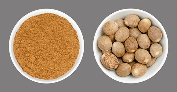 في جرعات مُنخفضة تُحسّن مذاق الأطعمة، ولكن عند الإفراط في تناولها، تظهر خصائصها السّامة. جوزة الطّيب الكاملة والمطحونة| Shutterstock, Peter Hermes Furian