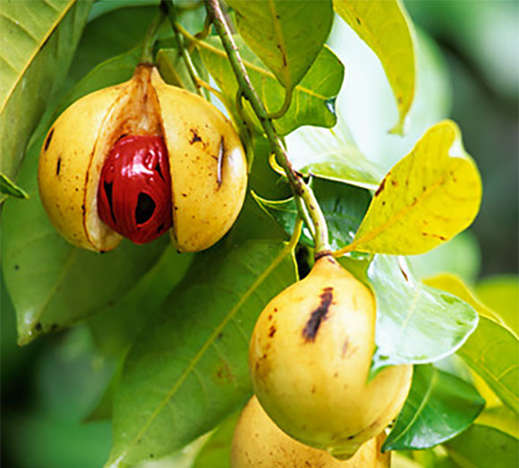 جوزة الطيب هي ليست جوزة، ولكنّها بذرة بُنّية تنمو على شجرة Myristica fragrans. ثمار الشجرة، والّتي تكشف إحداها البذرة بداخلها|David Nunuk, Science Photo Library