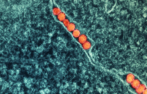 معظم المرضى لا يعرفون حتّى أنّهم قد أصيبوا بالعدوى، وأقلّ من واحد في المائة منهم قد يصابون بمرض خطير، بل ومميت. فيروسات حُمّى النيل الغربيّ، الصورة بالمجهر الإلكترونيّ | NATIONAL INSTITUTE OF ALLERGY AND INFECTIOUS DISEASES / NATIONAL INSTITUTES OF HEALTH / SCIENCE PHOTO LIBRARY