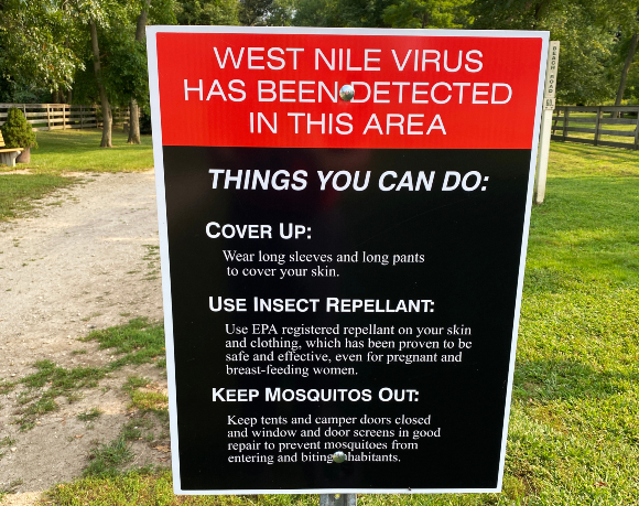 يساعد تغيّر المناخ والنشاط البشريّ على انتشار البعوض والأمراض. علامة تحذيريّة من حُمّى النيل الغربيّ، مع تعليمات حول كيفيّة تجنّب لدغات البعوض | تصوير: WoodysPhotos, Shutterstock