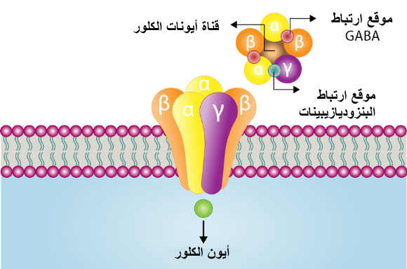 يرتبط جزيء البنزوديازيبين بموقع معيّن على مستقبل GABA، ممّا يؤدّي إلى تغيير في بنيته الفراغيّة، الأمر الذي يسمح بدخول عدد أكبر من أيونات الكلور إلى داخل الخليّة العصبيّة، ويثبط بذلك نقل الإشارة العصبيّة. مستقبل GABA على غشاء خليّة عصبيّة – منظر من الأعلى. | Ph-HY, Shutterstock