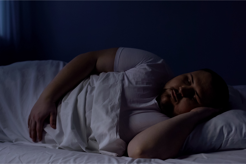 هناك قائمة طويلة من الأمراض والحالات الطبّيّة التي قد تسهم في ظهور الأرق، ومنها زيادة الوزن، وانقطاع النفس النوميّ وصعوبات التنفس. رجل يعاني من زيادة الوزن نائم | Motortion Films, Shutterstock