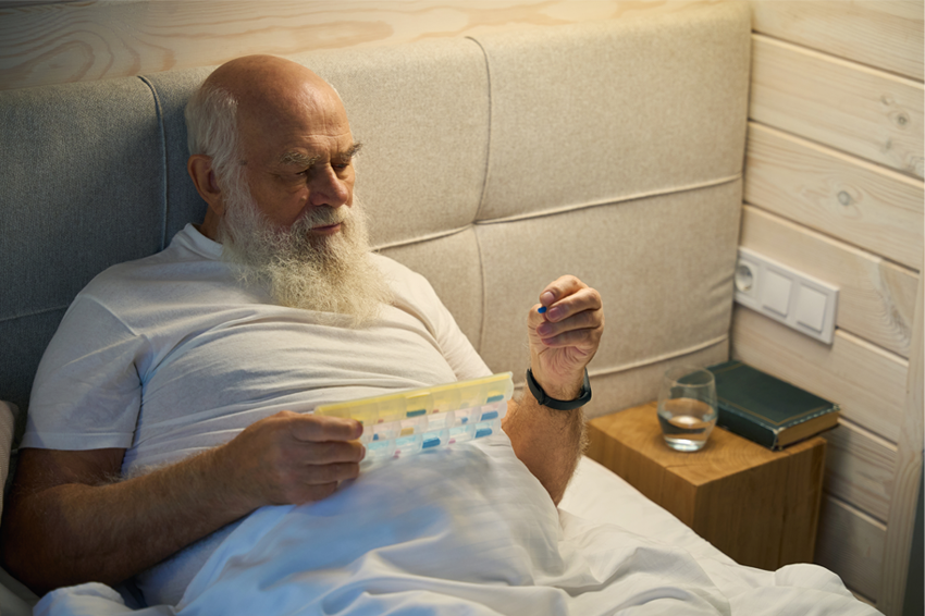 الأدوية المنوّمة قد تؤدي إلى اعتماد جسدي ونفسي، أي أن المريض يعتاد عليها ويُصبح من الصعب عليه النوم دون تناولها. رجل مسنّ يتناول دواءً منوّمًا | YAKOBCHUK VIACHESLAV، Shutterstock
