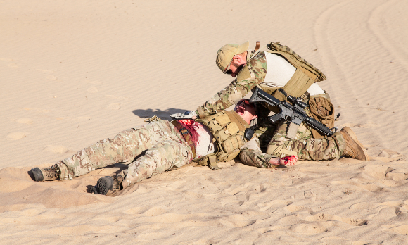 يشير التصنيف إلى أخطر إصابة في منطقة معيّنة من الجسم. مسعف عسكريّ يقدّم الإسعافات الأوليّة لجريح | تصوير: Getmilitaryphotos، Shutterstock