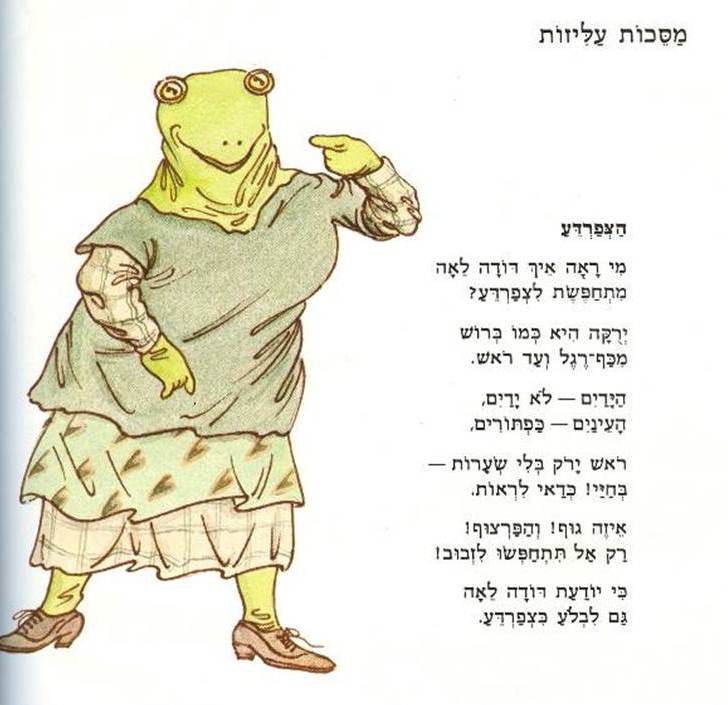مِنَ اليسار للأَعلى باتّجاه عقارب السّاعة: 1) ليمون؛ 2) شخصٌ ببذلة صفراء؛ 3) سبانخ؛ 4) الجدّة ليئة الّتي أَكلت كمّيّة مُبالغًا بها من السّبانخ، وتحوّلت إلى ضفدع | أُخِذَتِ الصُّوَرُ من ويكيبيديا؛ تصوير الشَّاشة من Youtube؛ ويكيبيديا؛ “هيّا أيّتها الغيوم”، رسم توضيحيّ: أُورا إيتان.