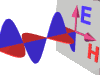 مِنَ اليمين: موجة عرضيّة – موجة EM باللّون الأزرق المجال الكهربائيّ، وباللّونِ الأحمر المجال المغناطيسيّ، وكلاهما متعامدين باتّجاه التَّقدُّم؛