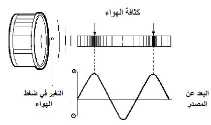 مِنَ اليسار: موجه طُوليّة – موجةُ صوتٍ، وفيها يتقدَّمُ الاضطراب في كثافة الهواء في الحيِّز.