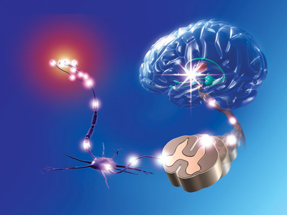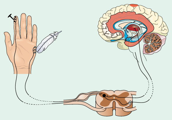 تقع مستقبلات الألم في كلّ أعضاء الجسم تقريبًا، وعندما تُفَعَّل، ترسل إشارات إلى الدّماغ. رسم يوضّح مرور الإشارات من مستقبلات الألم إلى الدّماغ. | Witt-Deguillaume، BSIP، Science Photo Library