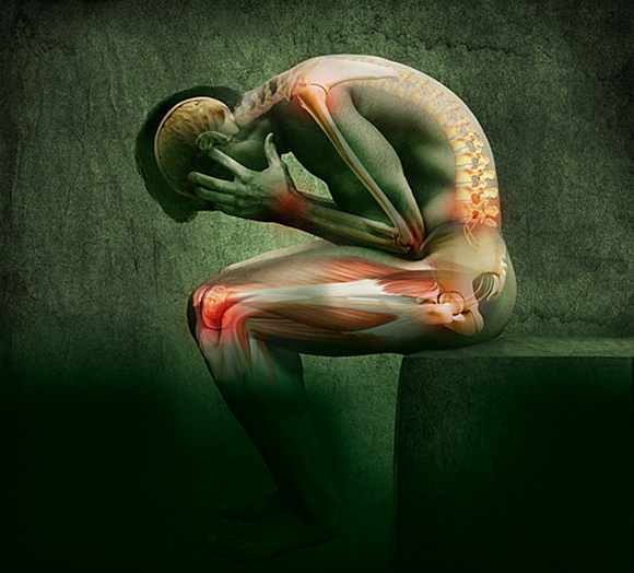 يبدو أن اللّعنة تتسبّب في تفعيل قويّ لجميع أنواع مستقبلات الألم. رسم توضيحيّ لشخص يعاني من الألم. | Witt-Deguillaume، BSIP، Science Photo Library