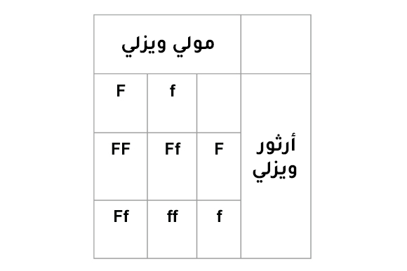 ننتقل إلى مثال آخر عن عائلة ويزلي، لنفرض أنّ مولي وآرثر ويزلي والدَي رون هم متباينا الزيغوت لسمة ظهور النمش، سينتج عن ذلك أنّ احتمال ظهور النمش على الوجه في نسلهما هو ثلاثة أرباع أو خمسة وسبعون بالمئة.