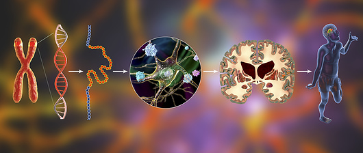 إنّ التكرار الزائد لسلسلة من ثلاثة نيوكليوتيدات في تسلسل الحمض النوويّ يؤدّي إلى إنتاج بروتينات معطوبة. رسم يوضّح مسبّبات مرض هانتنغتون. | Kateryna Kon, Science Photo Library