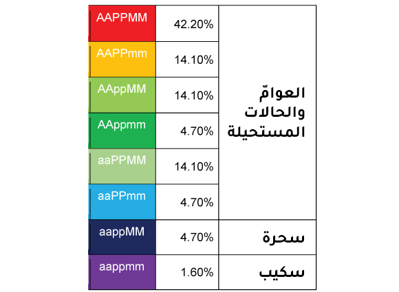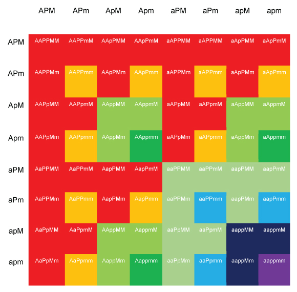 التوليفات الممكنة للجينات الثلاثة AaPpMm x AaPpMm: