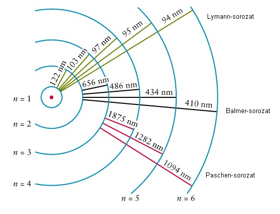 يعرض التخطيط موديل بور لذرّة الهيدروجين. مسارات الإلكترون بالأزرق، من المستوى الأوّل حتّى المستوى السادس. هذه مسارات دائريّة حول نواة الذرّة. عُرضت في الصورة أطوال أمواج الضُّويئات (الفوتونات) الّتي تنبعث في أعقاب انتقال إلكترون من مستوى إلى آخر. يمكن تمييز ثلاث منظومات من الانتقالات الممكنة بين المستويات، أُشيرَ إليها بألوان مختلفة. الانتقالات من أيّ مستوى كان إلى المستوى 1، والانتقالات من مستوى ما إلى المستوى 2، والانتقالات من مستوى ما إلى المستوى 3. لقد تمّ تشخيص هذه المنظومات الثلاث للانتقالات عن طريق التجربة قبل ظهور نموذج بور، ولكن لم يكن بالإمكان تفسيرها حينئذ، ووجدت تفسيرًا لائقًا في نموذج بور.