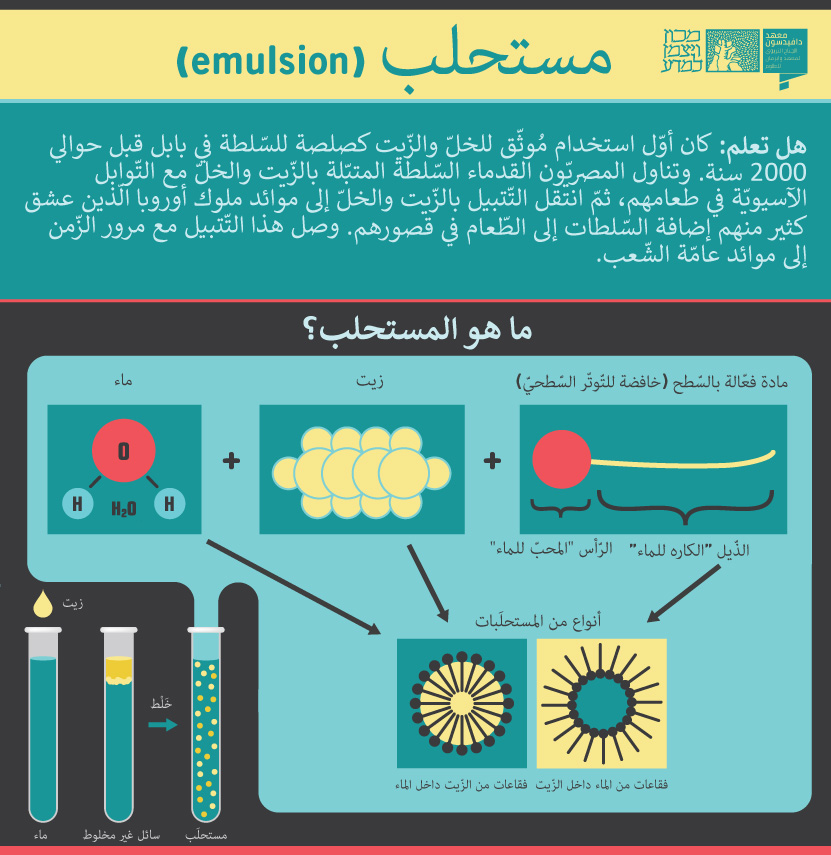 عندما نضع الزّيت والماء في إناء نحصل على طبقتين منفصلتين تمامًا. إذا حرَّكنا الخليط بشدَّة ينتج مستحلبٌ في البداية، أي قطرات صغيرة من الزّيت مُعلّقة في الماء، ويبدو خليطًا عكِرًا؛ لكن لا يثبت المستحلب على حاله وسرعان ما يعود الزّيت لينفصل عن الماء وتنتج طبقتان من جديد.