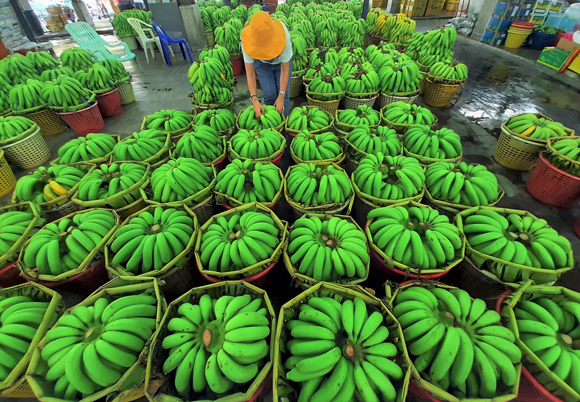 ينخفض محتوى النّشأ كلّما نضجت الثّمار، وبهذا يؤثّر على الطّعم والقوام. موز أخضر للبيع في سوق تايلاند | lakkana savaksuriyawong, Shutterstock