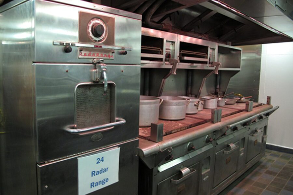 شركات تصنيع العتاد العسكريّ هي أولى الشركات التي صنعت أفران الميكروويف. أوّل فرن ميكروويف تجاريّ، في سفينة "سفانا"، 1947 |  flickr, Kelly Michals