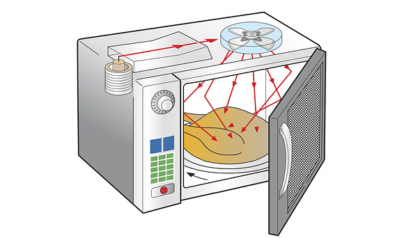 تحدث العمليّة ذاتها، تقريبًا، في فرن الميكروويف: تمتصّ الموادّ الغذائيّة مثل الزيوت والسّكّر، والماء بشكل خاصّ الأشعة التي يُولّدها الميكروويف، وتحوّلها إلى حرارة. يسخن الماء، الذي يُشكّل نسبة معيّنة من كافّة الموادّ الغذائيّة، فتنتقل حرارته إلى سائر أجزاء الغذاء. لا تمتصّ الموادّ البلاستيكيّة، مثلًا، أشعّة أمواج الميكرو – أي أنّها شفّافة لها، لذلك لا تسخن الأواني المصنوعة من البلاستيك في فرن الميكروويف. لماذا نشعر إذًا بسخونة الصحن البلاستيكيّ عند إخراجه من الميكروويف؟ الغذاء الموجود في الصحن هو الذي يسخن وينقل الحرارة إلى الصحن. تزداد سرعة حركة جسيمات المادة التي يتكوّن منها جسم ما عند ارتفاع درجة حرارته. توجد، بشكل عام، ثلاثة أنواع من الحركة التي تتحرّك بها جسيمات المادة: الحركة التذبذبيّة (الارتجاجيّة أو الاهتزازيّة) الموضعيّة، وهي حركة جسيمات المادّة في الحالة التراكميّة الصلبة، والحركة الدورانية التي تكسبها جسيمات المادة في الحالة التراكمية السائلة (جنبًا إلى جنب مع الحركة التذبذبية)، والحركة الانتقاليّة (الإزاحة) – أي انتقال الجُسيم من نقطة إلى أخرى في الفراغ – والتي تُضاف للجسيمات في الحالة التراكميّة الغازيّة. تزداد سرعة دوران الجزيئات – جزيئات الماء خاصّةً – فترتفع درجة حرارة الماء (درجة الحرارة هي مقياس لمعدل الطاقة الحركيّة لجسيمات المادّة). يمكن تمثيل ذلك بشخص يدفع الدوّامة (الكاروسيل) التي تدور بالأولاد من حين لآخر، فتزداد سرعة دورانها.