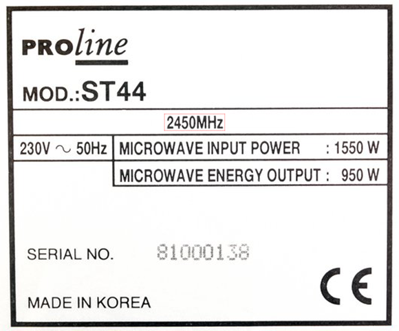 تردُّد عمل فرن المايكروويف مسجّلٌ عادةً على جدار الجهاز الخارجيّ الخلفيّ. التردّد المسجّل في الصورة أعلاه هو 2450 ميجا هيرتز | الصورة: Andrew Lambert Photography / Science Photo Library