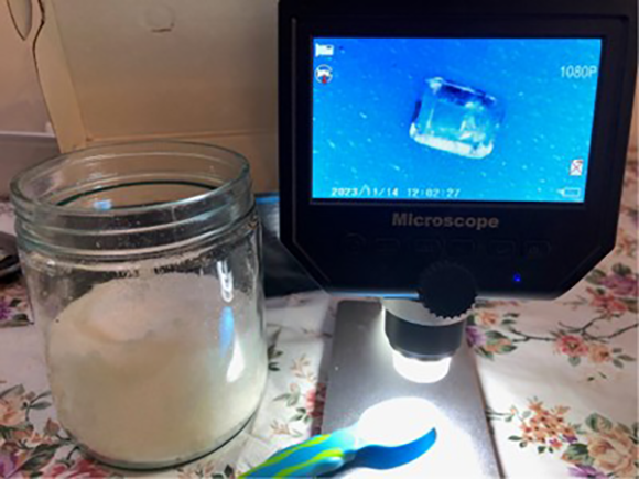 نشاهد أشكالًا مثيرة للاهتمام عند النظر إلى بلّورات السكر من خلال عدسة المجهر | تصوير: آڨي سايڠ وعيدان چليكازليك