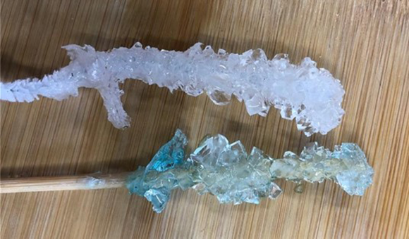نتائج التجربة: بلّورات سكّر كبيرة جدًّا على السيخ الخشبيّ | تصوير: آڨي سايڠ