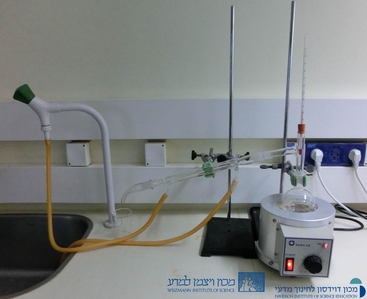 صورة: نظام تقطير مخبريّ بسيط. تُستعمل مياه الصنبور كسائل تبريد للمُكثّف.