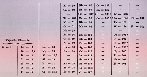 جدول مندلييف من سنة 1869م. قام بنشر النسخة المعروفة لدينا بعد ذلك بعامين. أعلاه: مندلييف نفسه | الصور: مكتبة صور العلوم Science Photo Library