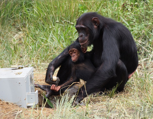 أثبت صندوق الألغاز الّذي يحتوي على الفول السودانيّ أنّه يمثّل تحدّيًا كبيرًا لمجموعتين من الشمبانزيّ في زامبيا. الشمبانزيّ البالغ مع شبل مهتمّ بالصندوق | المصدر: Sarah DeTroy