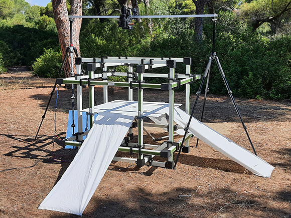 قام فريق البحث بتشويش المجال المغناطيسيّ في محيط قرية النمل وأثر في اكتساب مهارات الملاحة لدى النمل الصغير. جهاز ملفات هيلمهولتز المستخدم في التجربة | المصدر:  Robin Grob
