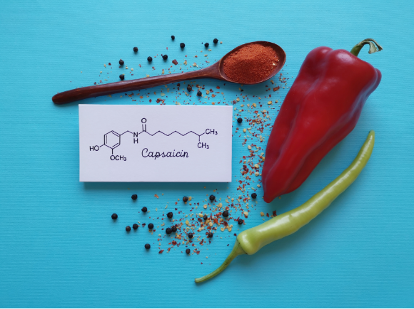 عندما تناول محبّو الأطعمة الحارّة صلصة بفلفل ذي تركيز منخفض من الكابسيسين، أثّرت التوقّعات في تجربتهم. فلفل حارّ بجانب التركيب الجزيئيّ للكابسيسين | Shutterstock, Danijela Maksimovic