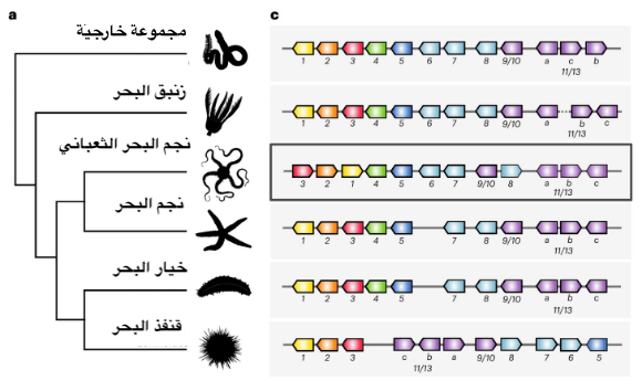 قام الباحثون بمقارنة وظائف الجينات النّشطة لدى نجم البحر الثّعبانيّ بوظائفها في كائنات أخرى، للتّحقق ممّا إذا كانت الجينات نفسها تشارك في عمليّات انقسام الخلايا أثناء التّجدّد، وفي النّموّ والتّمايز. مجموعات مختلفة من الكائنات الحيّة، مدى قربها من نجم البحر الثّعبانيّ، والجينات المشتركة بينها | مقتبس من المقال Parey et al., 2024