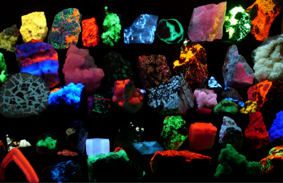 تطول مدّة انبعاث الأشعّة في ظاهرة اللصف الاستشعاعيّ (الفَلْوريّة – Fluorescence) نانو ثواني. مجموعة مختارة من المعادن الّتي ينبعث منها الضّوء من خلال عمليّة الفلوريّة ا على أثر تعرّضها للأشعّة فوق البنفسجيّة | Hannes Grobe/AWI, Wikimedia