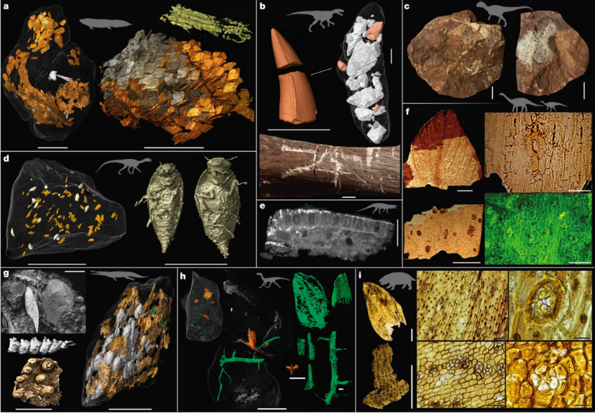 كما وقد مرّت العيّنات بسلسلةٍ من الفحوصات التّحليليّة، كالمجهر الإلكترونيّ، المطيافيّة الضّوئيّة، والكروماتوغرافيا، بهدف الكشف عن موادّ عضويّة ومعدنيّة. قد ساهمت مقارنة العيّنات المختلفة بالكيوتيكولات النّباتية —وهي طبقات دهنيّة تُغلِّف أجزاء معيّنة من النّباتات— في إعادة بناء النّظام الغذائيّ للدّيناصورات آكلةِ الأعشاب؛ بينما كشفت التّحاليل العضويّة والكيميائيّة تفاصيل إضافية عن بيئة الغذاء وعن العمليّات الّتي أدّت إلى تحوّله إلى موادّ معدنيّة. في حين كشفت العيّنات المكوّنة من بقايا نباتات وأسماك وفرائس صغيرة وكبيرة، عن تنوّع حيويّ وغذائيّ هائل، ساهم بدوره بتشكيل شبكات غذائيّة معقّدة.