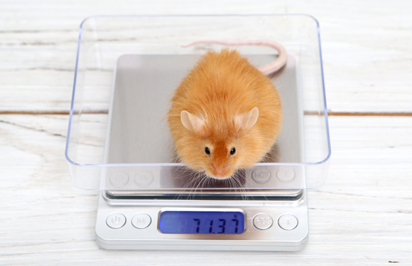 تمّ زرع براز نساء مصابات بفقدان الشهيّة في أمعاء فأرات، وذلك بهدف فحص تأثير تركيب ميكروبيوم المصابات في وزن الفأرات. فأرة على الميزان| Sergey Bezgodov, Shutterstock