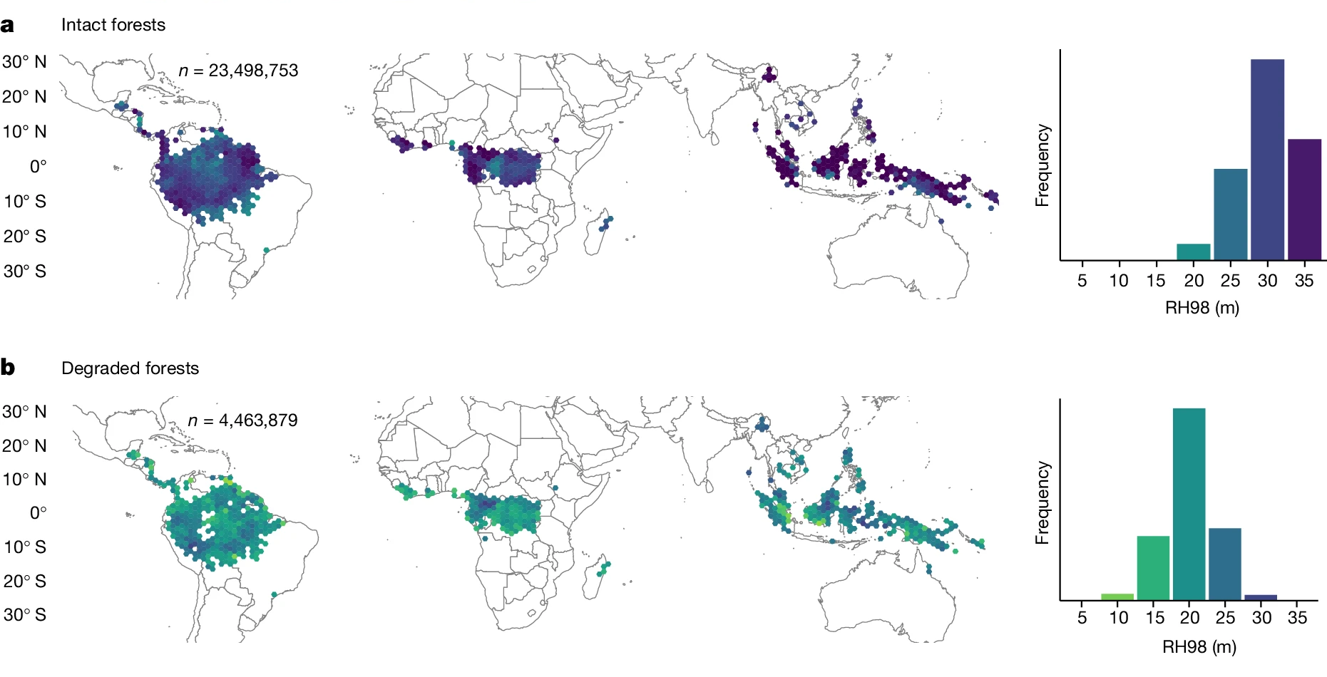 حسب الباحثون مدى تضرّر الغابات، مع التركيز على الانخفاض في ارتفاع مظلّة الغابة والتراجع في الكتلة الحيويّة للأشجار. يُظهر الرسم البيانيّ ارتفاع مظلّة الغابة في الغابات غير المتضرّرة (في الأعلى) مقارنةً بالغابات التي تضرّرت بسبب القطع، الحرائق أو عوامل أخرى. ويمكن ملاحظة أنّ المظلّة في الحالة الثانية أقلّ ارتفاعًا بشكل ملحوظ. | من مقال Bourgoin, C. et al.. Nature 2024