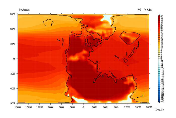 نُسِبَ الانقراض لثورات بركانيّة ضخمة في منطقة سيبيريا تسبّبت في ارتفاع حرارة الأرض. درجات الحرارة في الشّهر الأكثر حرارة، في الفترة الأشدّ احترارًا من عصر الانقراض البرميّ-الثّلاثىّ | University of Bristol and China University of Geosciences (Wuhan)