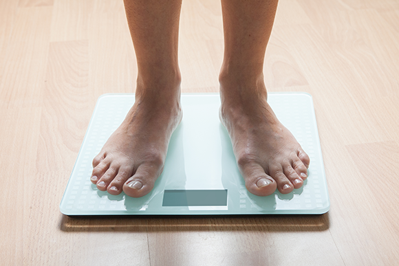 إحدى المشاكل في الدراسة هي أنّ المشاركين أفادوا بأنفسهم عن وزنهم ومحيط خصورهم. امرأة تقف على ميزان شخصيّ | olegius, Shutterstock