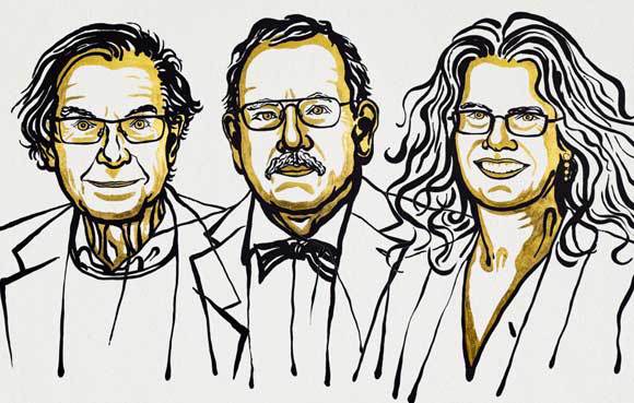 الحائزون على نوبل في الفيزياء للعام 2020، من اليمين إلى اليسار: أندريا جيز، رينهارد جانزيل وروجر بنروز| المصدر: موقع جائزة نوبل