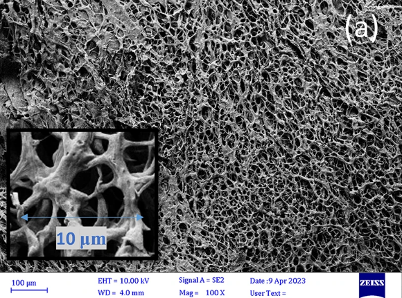 الموادّ الموجودة في جدار الخليّة الفطريّة مناسبة لإنتاج هلام ثابت وقويّ. صورة بالمجهر الإلكترونيّ الماسح، للهلام الّذي أنتجه الباحثون من العفن | من مقالة الدّراسة