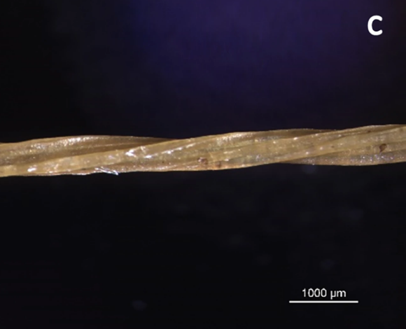يجب تحسين مرونة الألياف واختبار متانتها، ولكن هذه هي الخطوة الأولى. صورة لليف قام الباحثون بغزله من هلام الفطر. | من مقالة الدراسة