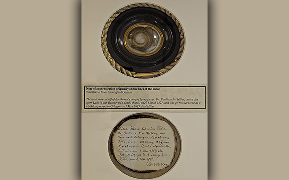 تبين أنَّ عيّنة الشعر الأولى الّتي عثر فيها على نسبة عالية من الرصاص تعود لامرأة يهوديّة وليس لبيتهوفن. خصلة من الشعر منسوبة بالخطأ إلى الملحّن | المصدر: Ira F. Brilliant Center for Beethoven Studies