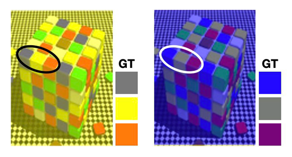 تحت الإضاءة الصّفراء (يسار) تبدو المربّعات الرّماديّة زرقاء، وتحت الإضاءة الزّرقاء تبدو صفراء. ألوان المربّعات الموجودة أسفل GT هي الألوان الفعليّة للثّلاثيّات المميّزة | المصدر: Cohen-Duwek et al