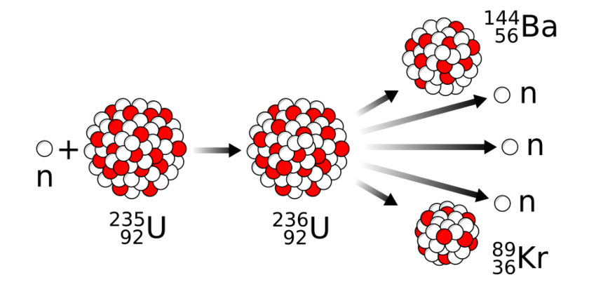 عملية تُطلق فيها طاقة هائلة. يخترق نيوترون نواة ذرة اليورانيوم-235، محولاً إياها فوراً إلى يورانيوم-236، الذي ينشطر بدوره إلى ذرتي كريبتون وباريوم، مُصدراً ثلاثة نيوترونات تُكمل التفاعل المتسلسل | صورة توضيحية: MikeRun, Wikipedia
