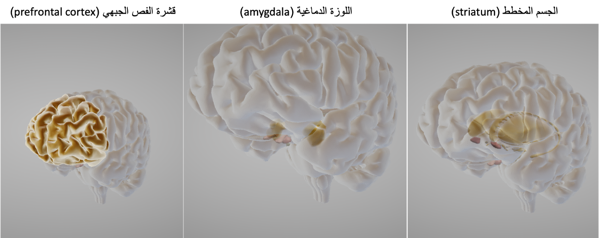 المناطق الموجودة داخل قشرة الفصّ الجبهيّ (prefrontal cortex)، والجسم المخطّط (striatum)، واللّوزة الدّماغيّة (amygdala) تعمل بطريقة منسّقة لإنتاج الذّخيرة السّلوكيّة الغنيّة الّتي نشاهدها خلال اللّعب | الصور ماخوذة من موقع Neurotorium