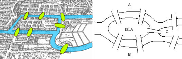 השם קניגסברג הוא שם גרמני היסטורי לעיר קלינינגרד שברוסיה של היום, אך במאה ה-18 היא הייתה חלק מממלכת פרוסיה. קניגסברג הייתה עיר משגשגת על גדות נהר פרגל (Pregel), עמוסת פעילות מסחרית ובעלת מעמד כלכלי יציב שאיפשר לתושביה לבנות שבעה גשרים שחצו את הנהר וחיברו בין חלקי העיר השונים. כפי שניתן לראות באיור, הגשרים חיברו בין האי המרכזי (ISLA) לבין חלקי העיר A, B, C.