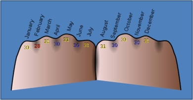 דרך קלה לחשב אילו חודשים הם בני 31 יום. אגרף את שני ידיך כך שיהו לפניך. התחל לספור משמאל לימין – כל מפרק ורווח בין מפרקים על פי שם החודש. כל חודש שנופל על מפרק הוא בן 31 יום – תמיד. כל השאר הם בני 30 יטם חוץ מפברואר שהוא בו 28 יום או 29 יום (כל 4 שנים). באדיבות ויקיפדיה.