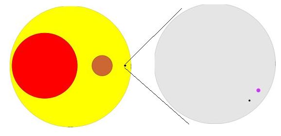 תמונה להמחשת גודלו (באופן יחסי) של חור שחור. מימין העיגול הצהוב היא השמש שלנו, העיגול האדום ננס אדום, העיגול החום ננס חום והנקודה השחורה ננס לבן או שחור. משמאל הננס הלבן מוגדל ומיוצג כעיגול האפור. בהשוואה אליו ניתן לראות את גודלו של כוכב נויטרונים (סגול) וחור שחור (הנקודה השחורה). נילקח ועובד מוויקיפדיה.