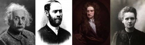 מימין לשמאל: מרי קירי, ניוטון, הרץ ואיינשטיין. תמונות נלקחו מויקיפדיה.